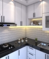 Pencahayaan menggunakan lampu LED warm white di bawah kabinet atas, menambah kenyamanan sekaligus mempercantik tampilan. Desain handle yang simpel dan posisi bukaan yang ergonomis turut mendukung kenyamanan penggunaan sehari-hari. Selain itu, terdapat rak terbuka dan rak kaca buram sebagai elemen visual yang menambah daya tarik tanpa mengorbankan fungsi.