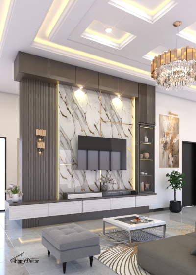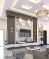 Ruang keluarga ini dirancang dengan sentuhan modern minimalis yang elegan. Nuansa abu lembut dan coklat kayu berpadu harmonis dengan tekstur marmer pada backdrop TV, menciptakan tampilan mewah namun tetap hangat. Garis vertikal pada panel dinding memperkuat kesan modern sekaligus memberikan ritme visual yang dinamis.